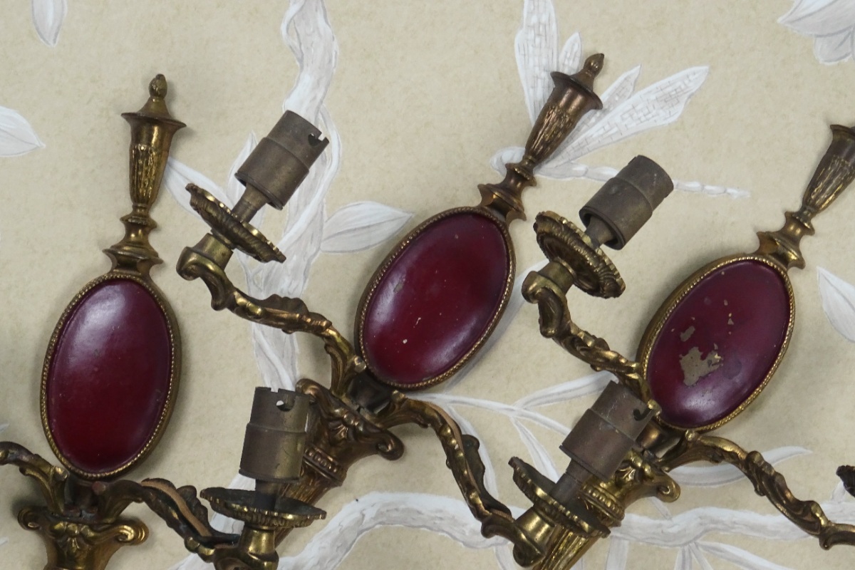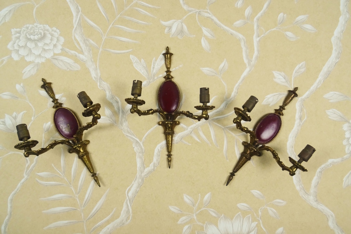 A very decorative set of three antique Regency Revival gilded brass two wall lights in need of restoration.