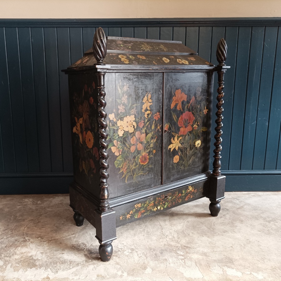 A most unusual pagoda top black lacquered two door ‘Cabinet of Curiosities’ painted with flower motifs to the front, sides and top.