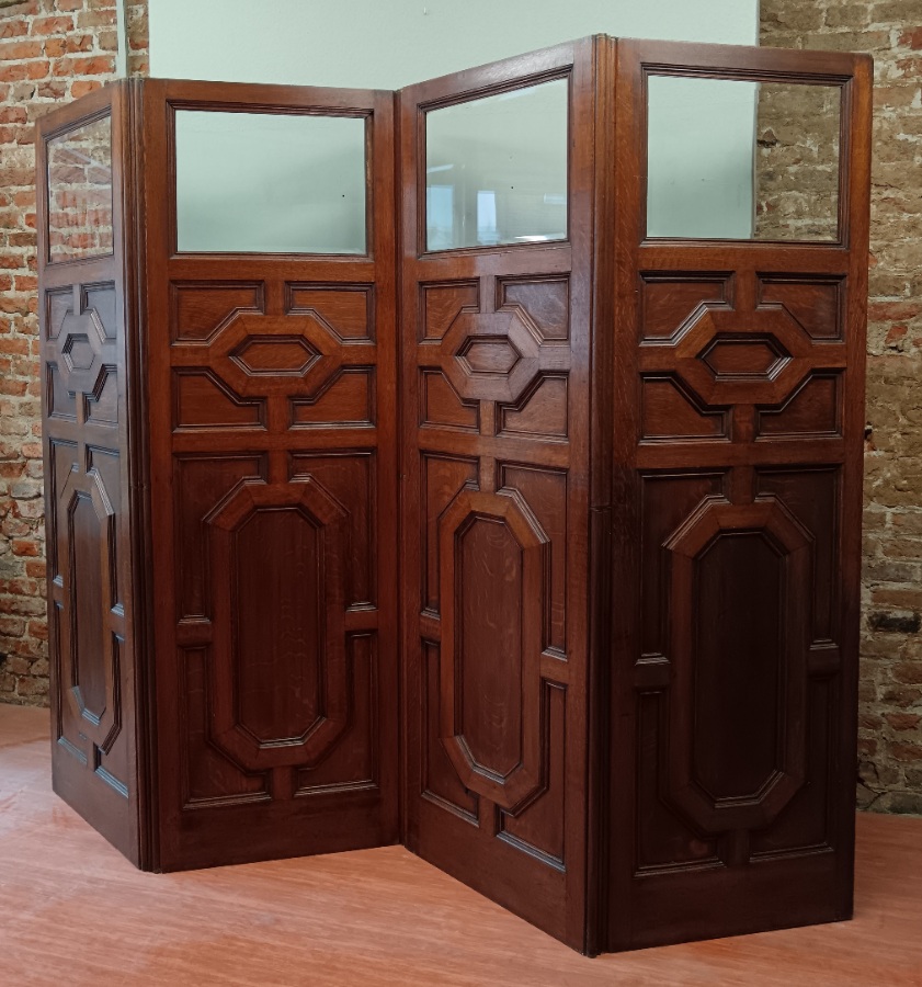 A superb four panel folding screen - room divider in excellent condition from the Queen Ann Revival period (circa 1890 and 1914).