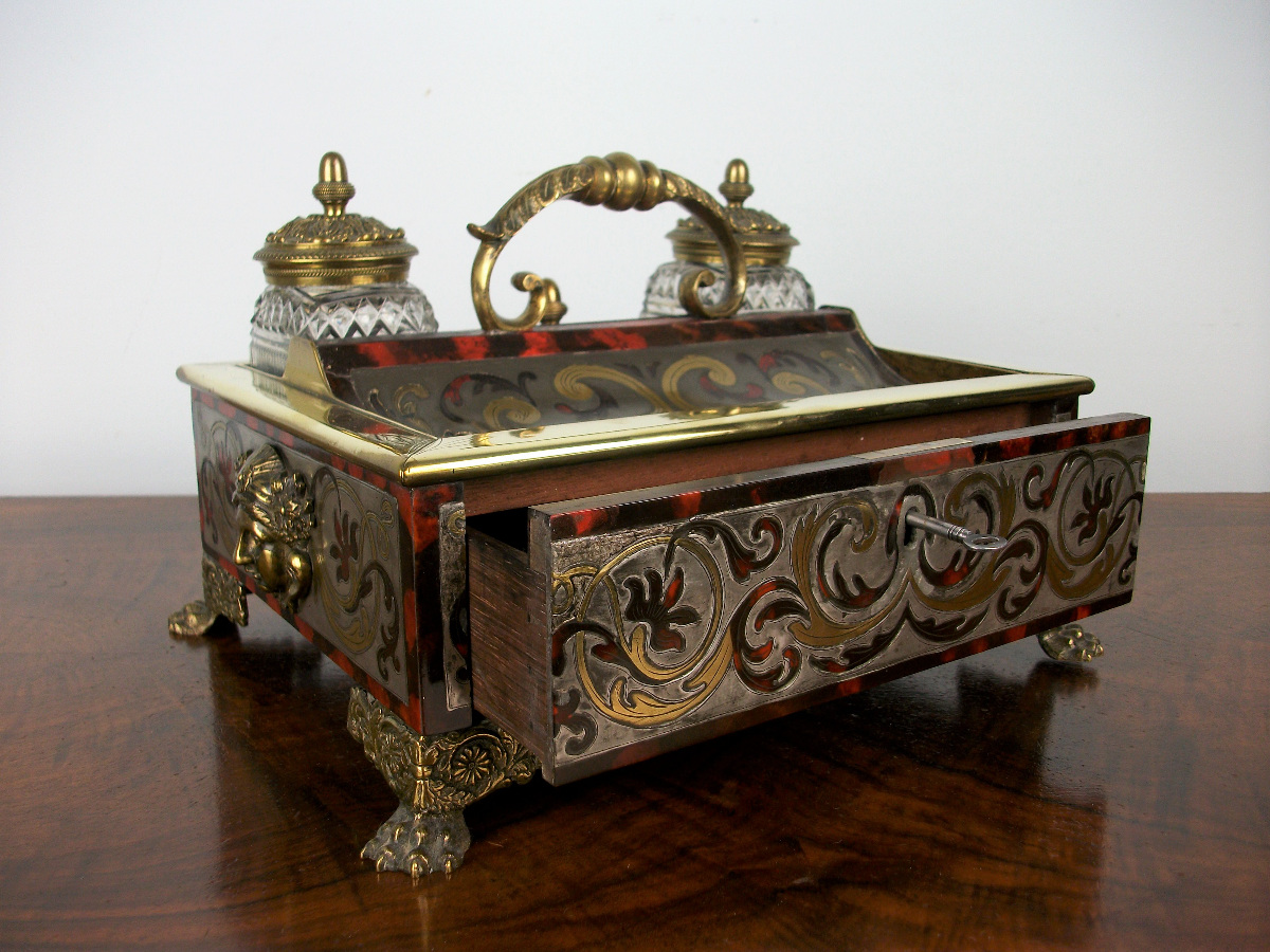 An outstanding table inkstand of silvered pewter, brass and tortoiseshell contre-partie 'Boulle' inlay with applied gilt bronze female masks to the sides.