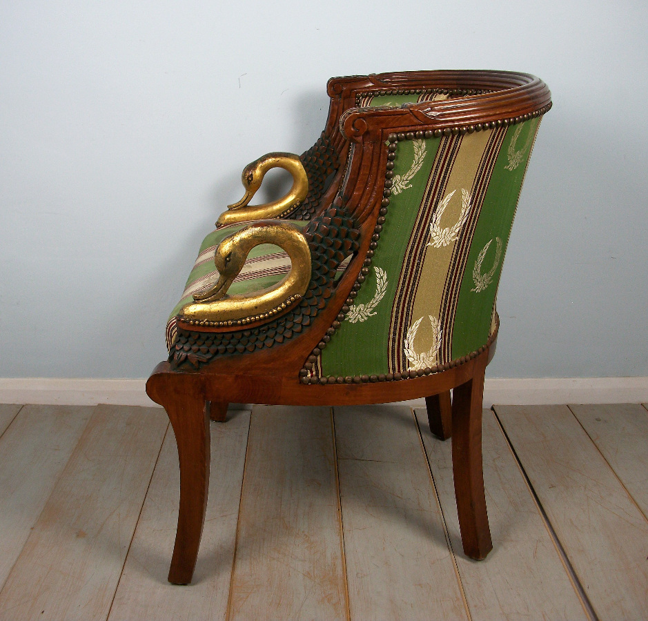 Of large proportions this very comfortable tub chair has superb details, especially in the gilded carved swan arms.
