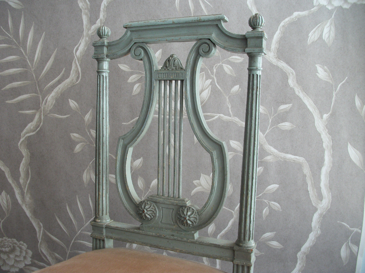 Having a profusely detailed carved lyre back and turned reeded legs and their original French Grey paint, these chairs are absolutely charming and desirable.